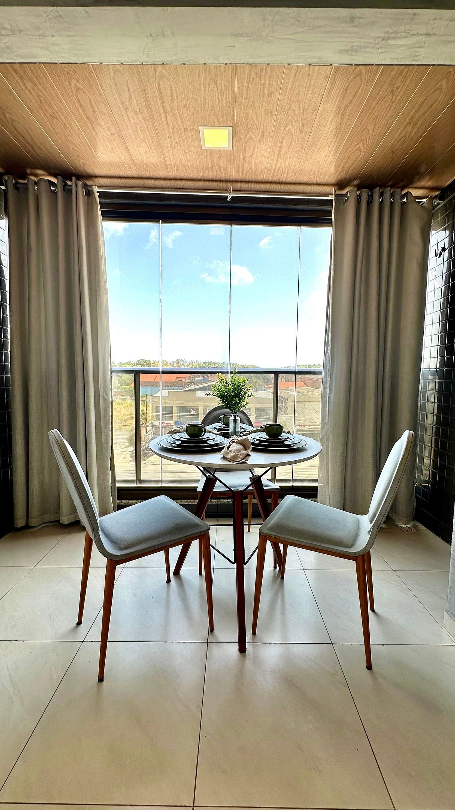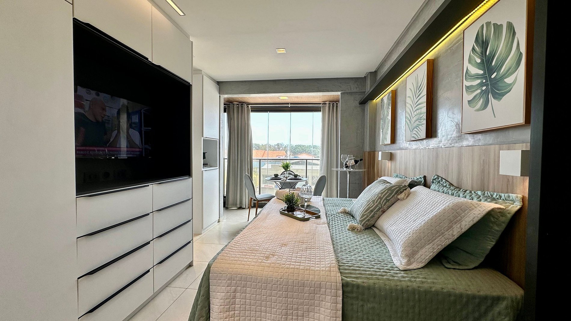 O estúdio possui 30 m², é nascente e conta com varanda com vista para a cidade. O ambiente é integrado, unindo quarto e sala em um layout funcional e moderno, além de cozinha americana e banheiro privativo.