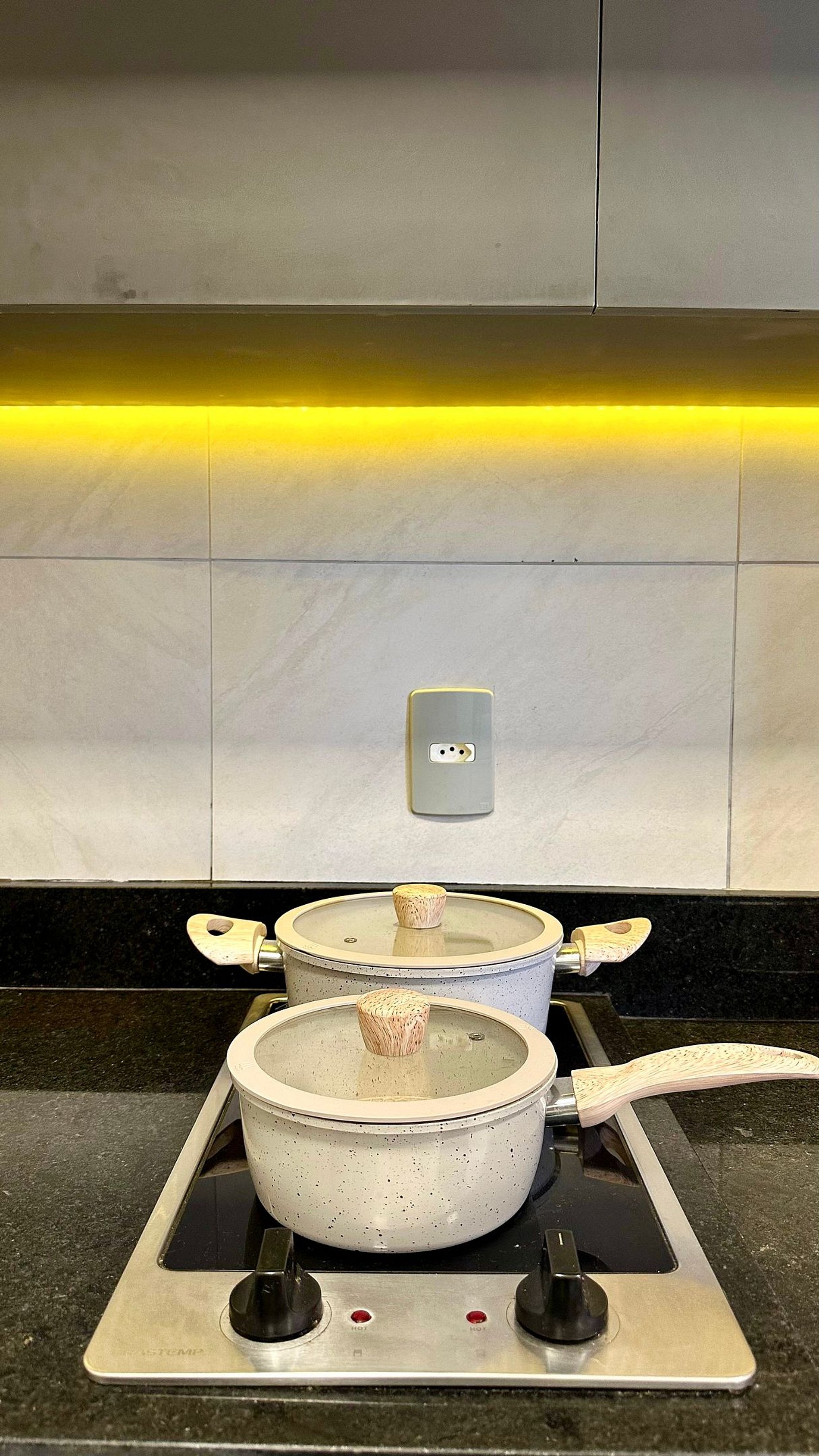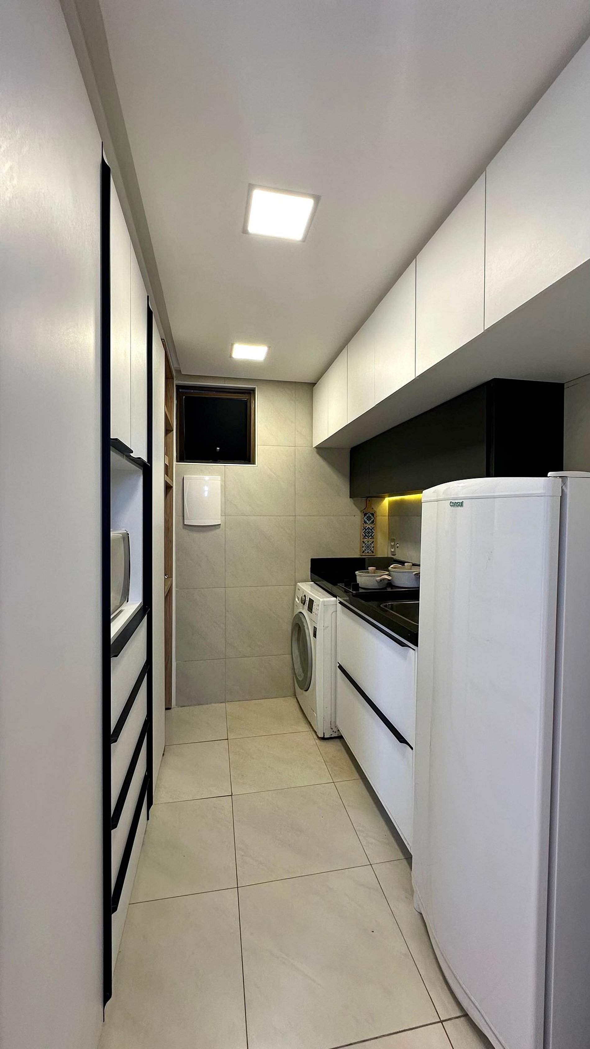 A cozinha é completa com geladeira, micro-ondas, fogão por indução de duas bocas, máquina de lavar roupa e todos os utensílios básicos para preparo das refeições. Como cortesia, oferecemos cafeteira com cápsulas para uma chegada mais acolhedora.