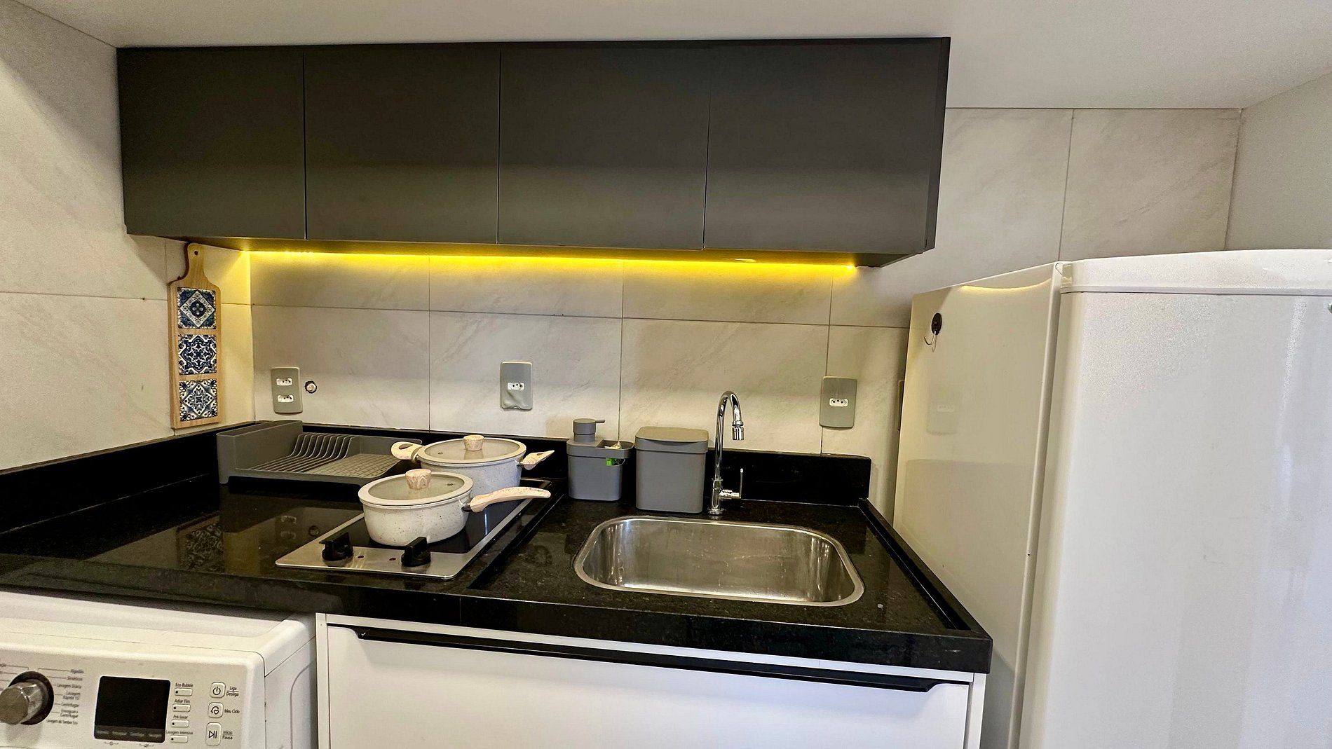 A cozinha é completa com geladeira, micro-ondas, fogão por indução de duas bocas, máquina de lavar roupa e todos os utensílios básicos para preparo das refeições. Como cortesia, oferecemos cafeteira com cápsulas para uma chegada mais acolhedora.