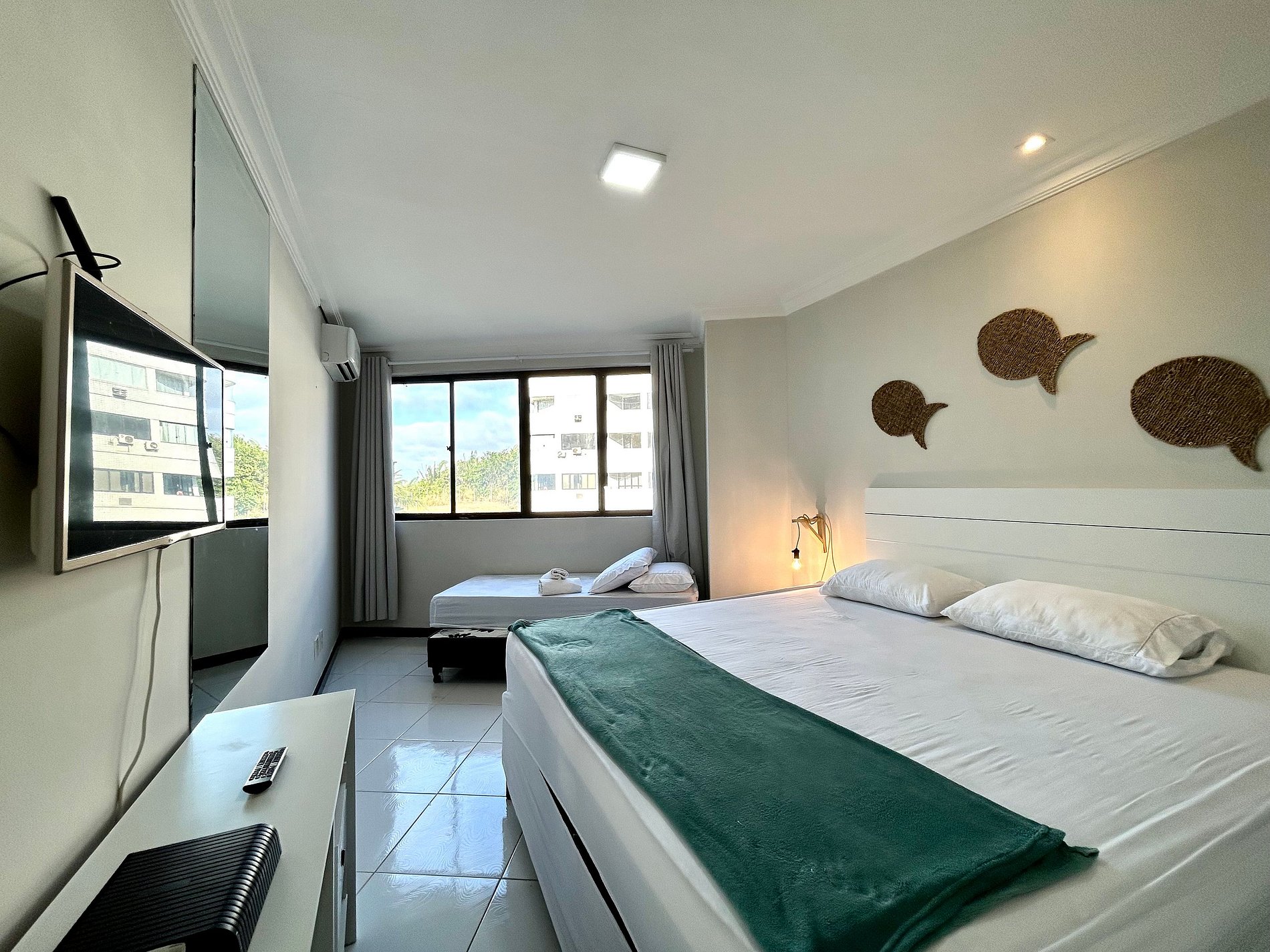 Apartamento com vista para a piscina, design rústico praiano, localizado no bairro Quintas do Calhau, ao lado da praia da Litorânea. O apartamento passou por uma reforma com design rústico praiano e está localizado em um bairro privilegiado de São Luís, ao lado da melhor praia da cidade, a Litorânea. Ideal para estadias curtas ou longas, possui: • Cama King, cama de solteiro com bicama e sofá-cama • Smart TV, cozinha completa e utensílios básicos • Wi-Fi 400 Mb e ar-condicionado