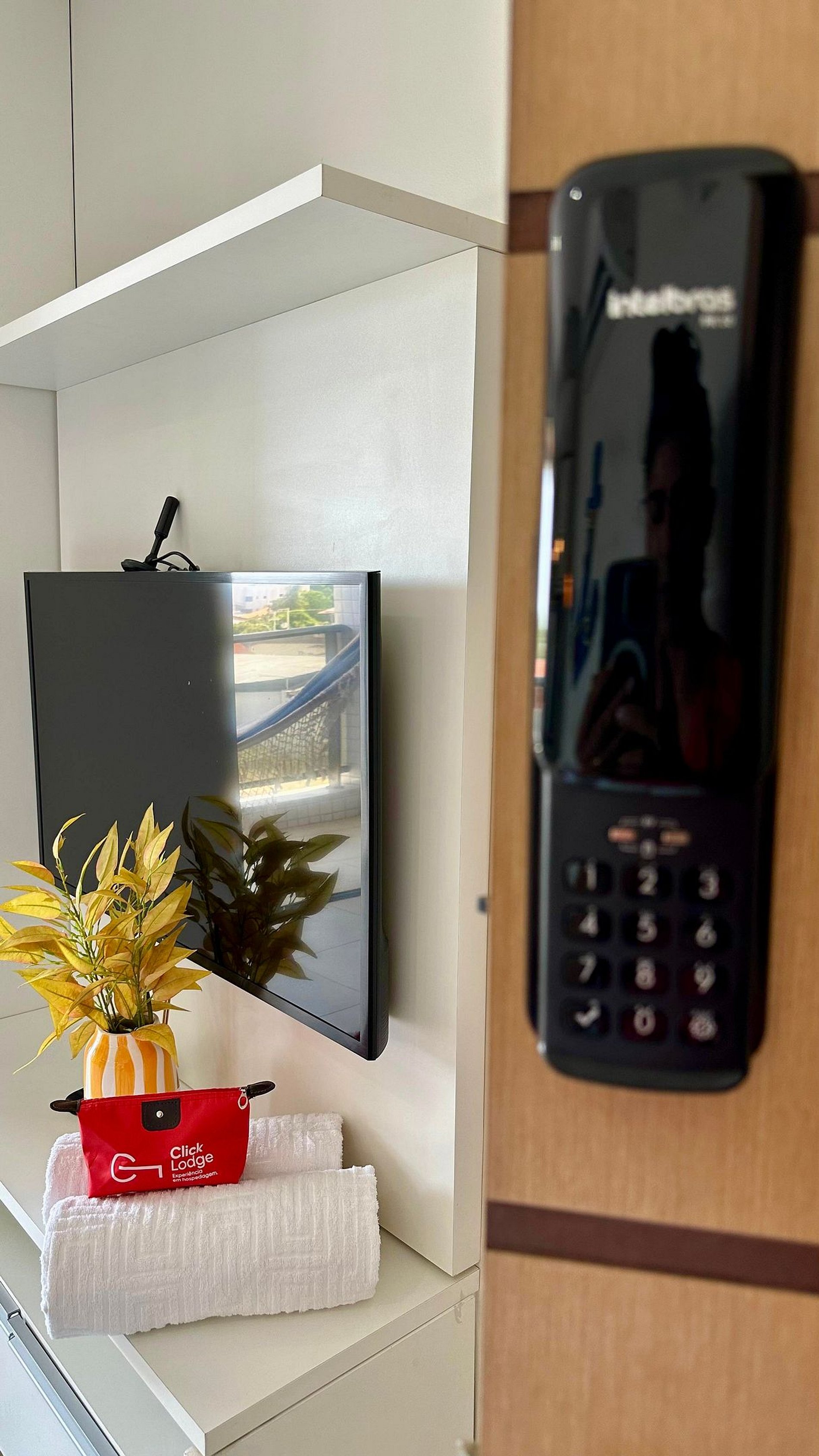 O acesso ao apartamento é feito pelo elevador, localizado no hall de entrada, e a porta conta com fechadura digital. O código de acesso será enviado previamente junto ao manual de check-in.