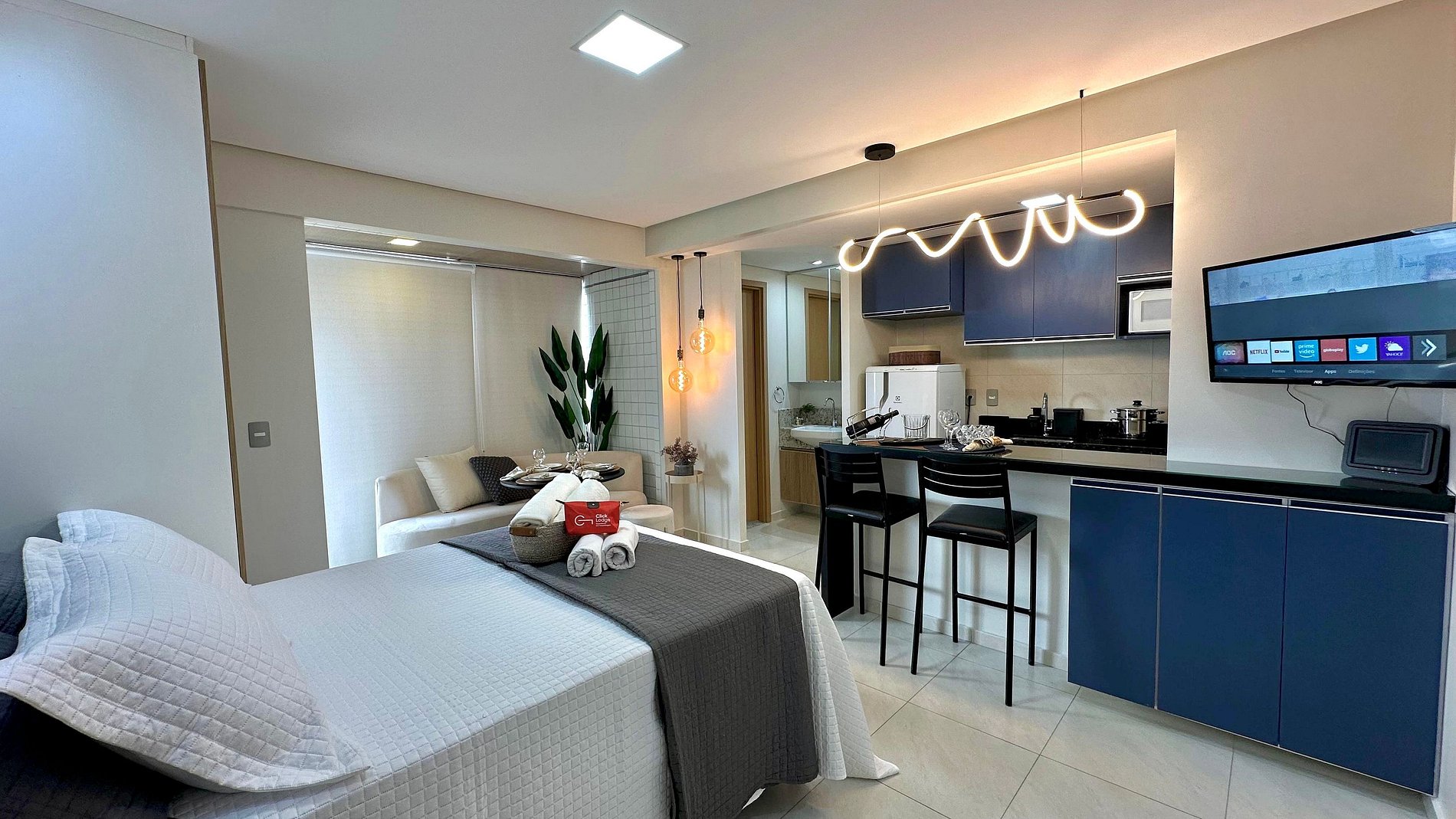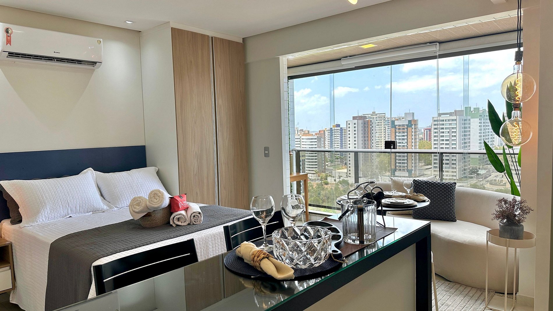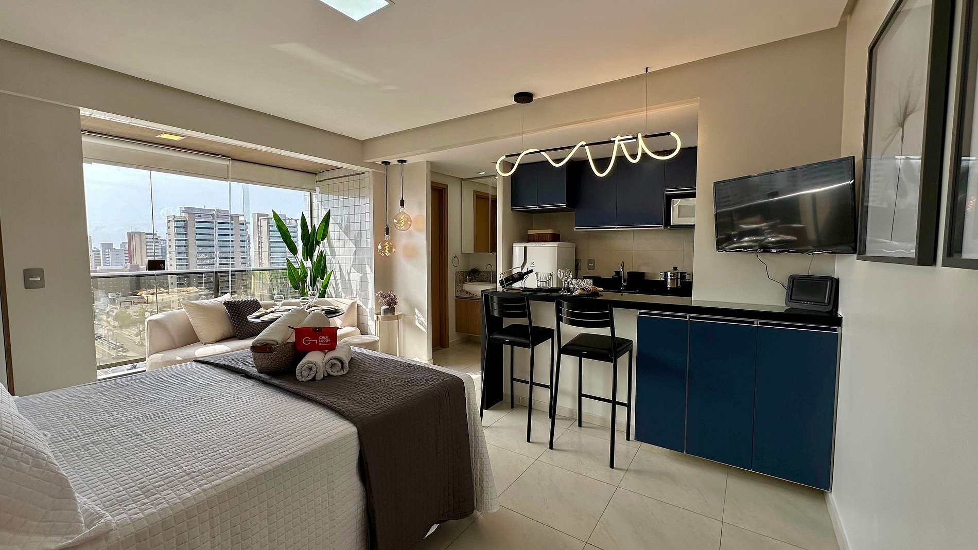 O estúdio possui 30 m², é nascente e conta com uma sacada com vista para a cidade. O ambiente é integrado, unindo quarto e sala em um layout funcional e moderno, além de cozinha americana e banheiro privativo.