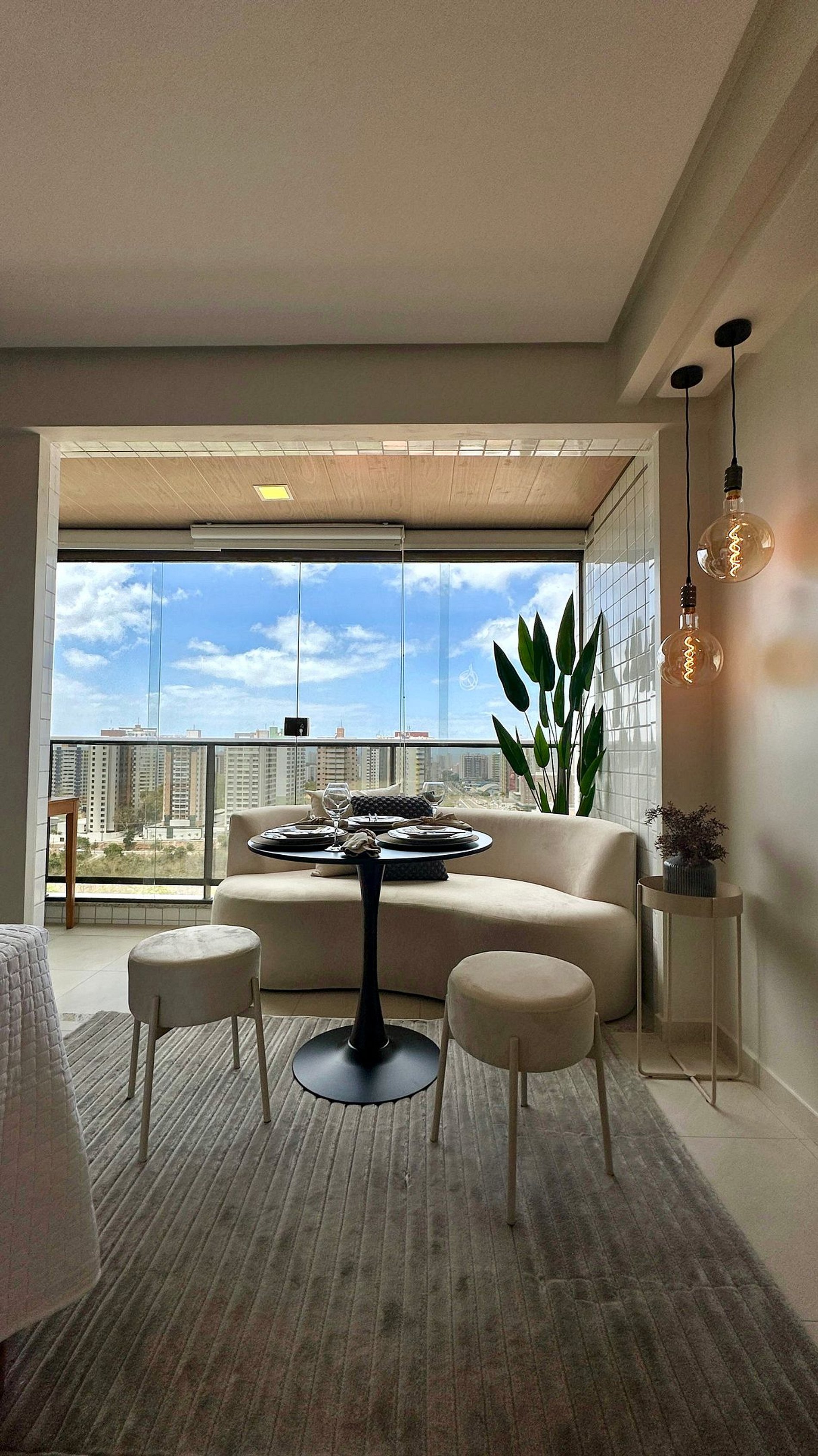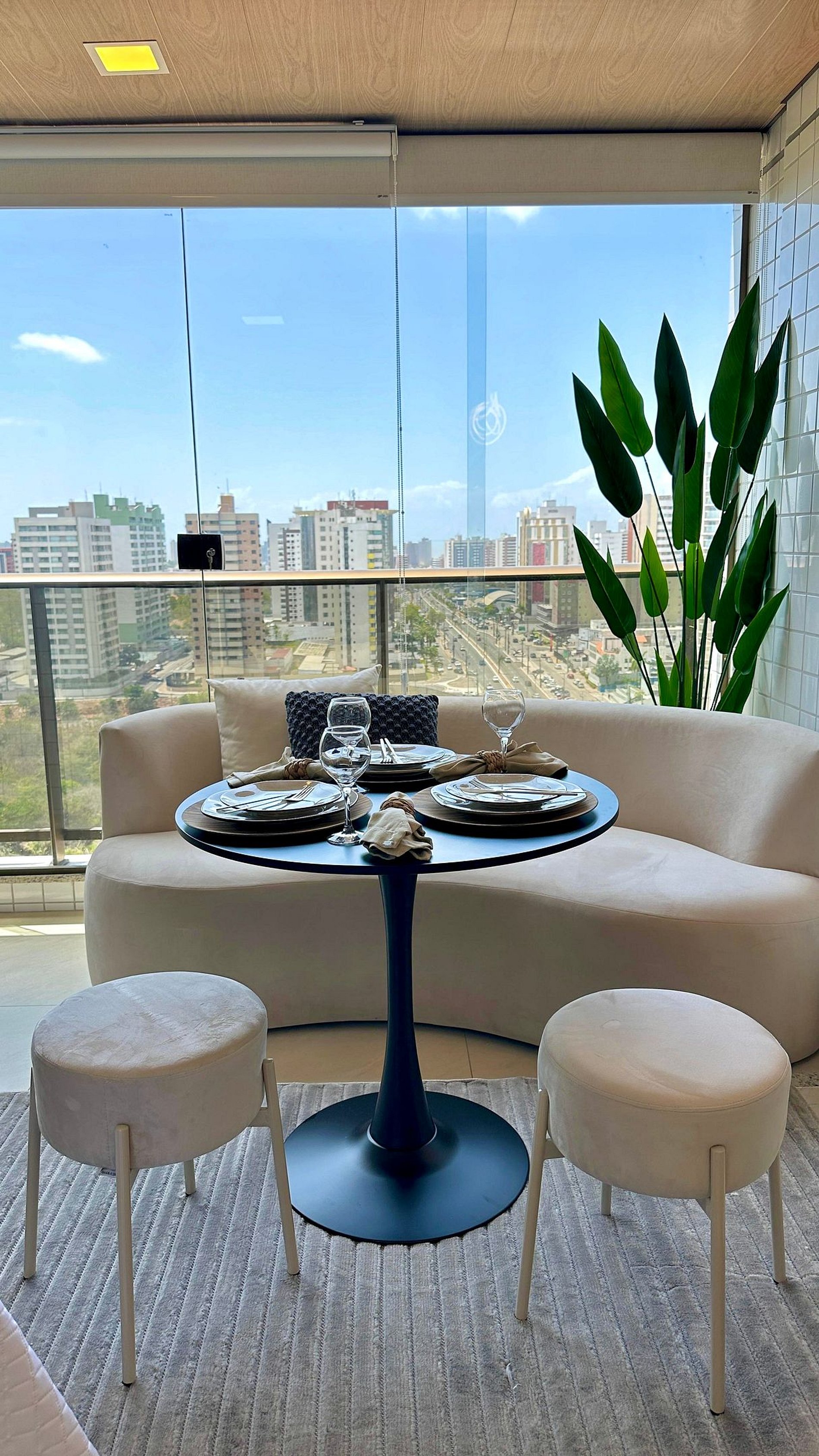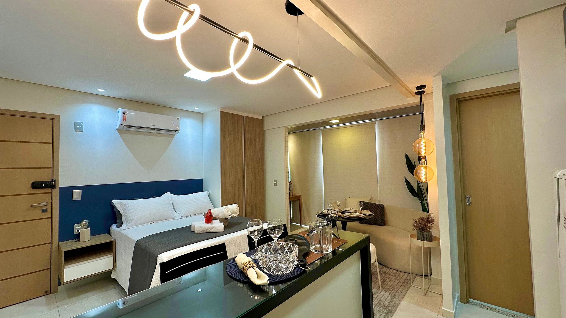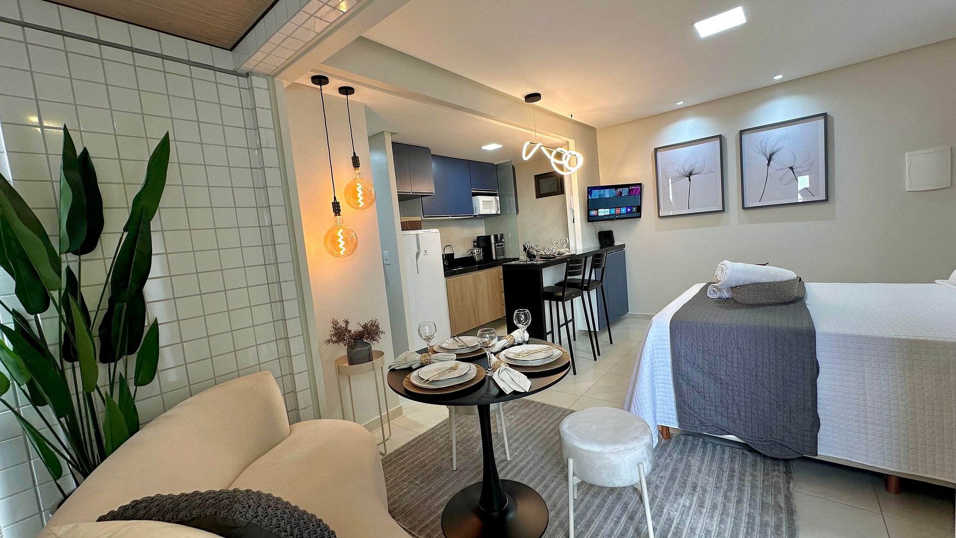 O estúdio possui 30 m², é nascente e conta com uma sacada com vista para a cidade. O ambiente é integrado, unindo quarto e sala em um layout funcional e moderno, além de cozinha americana e banheiro privativo.
