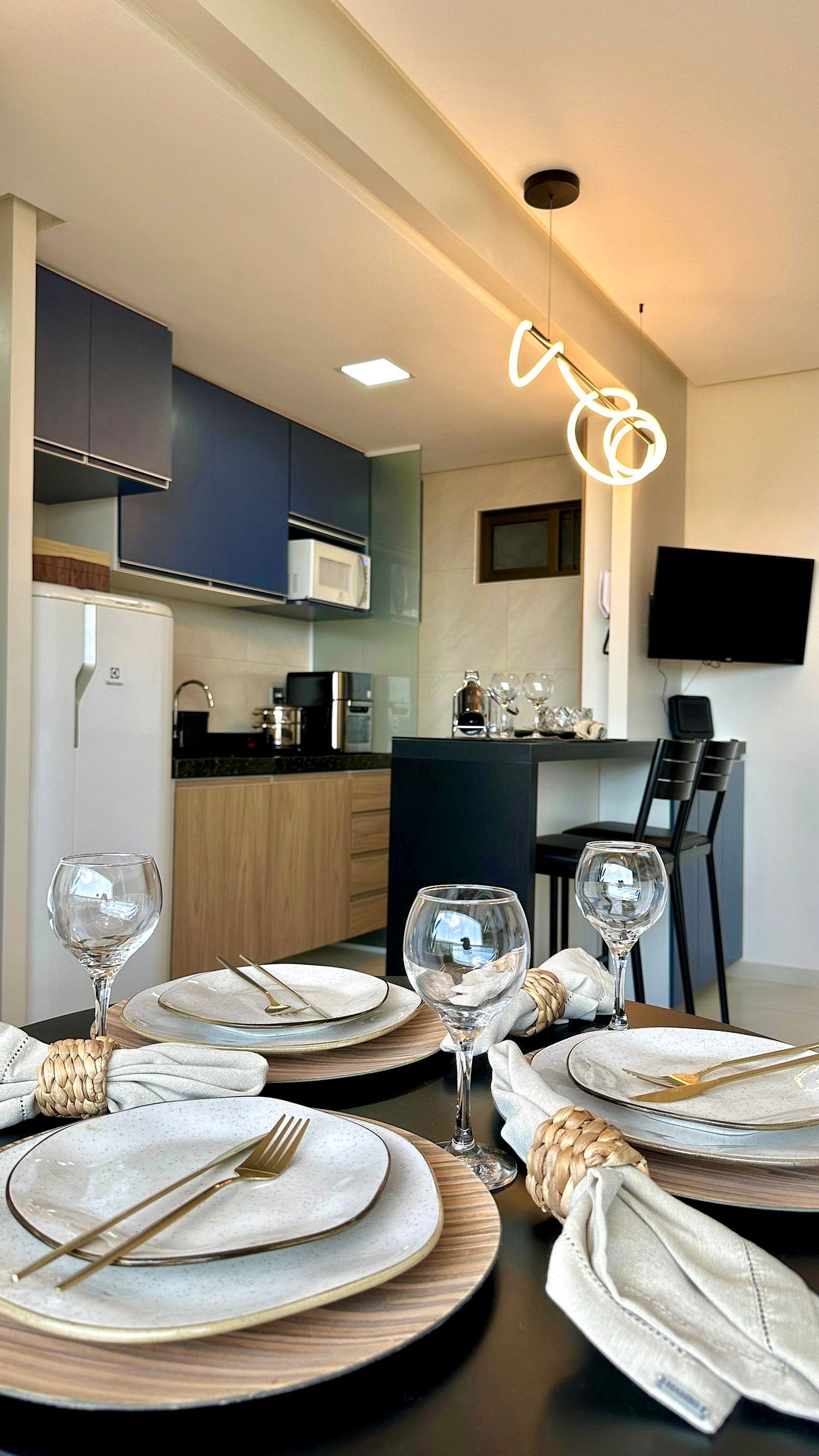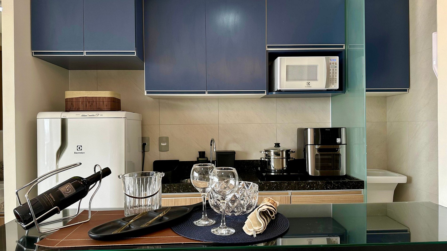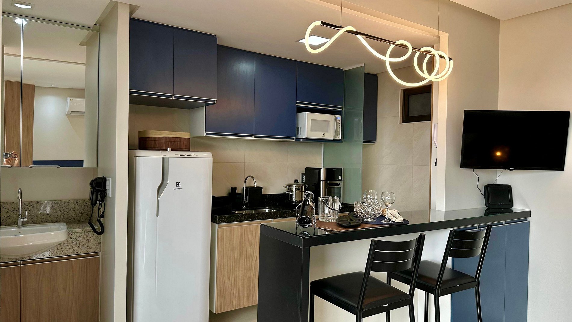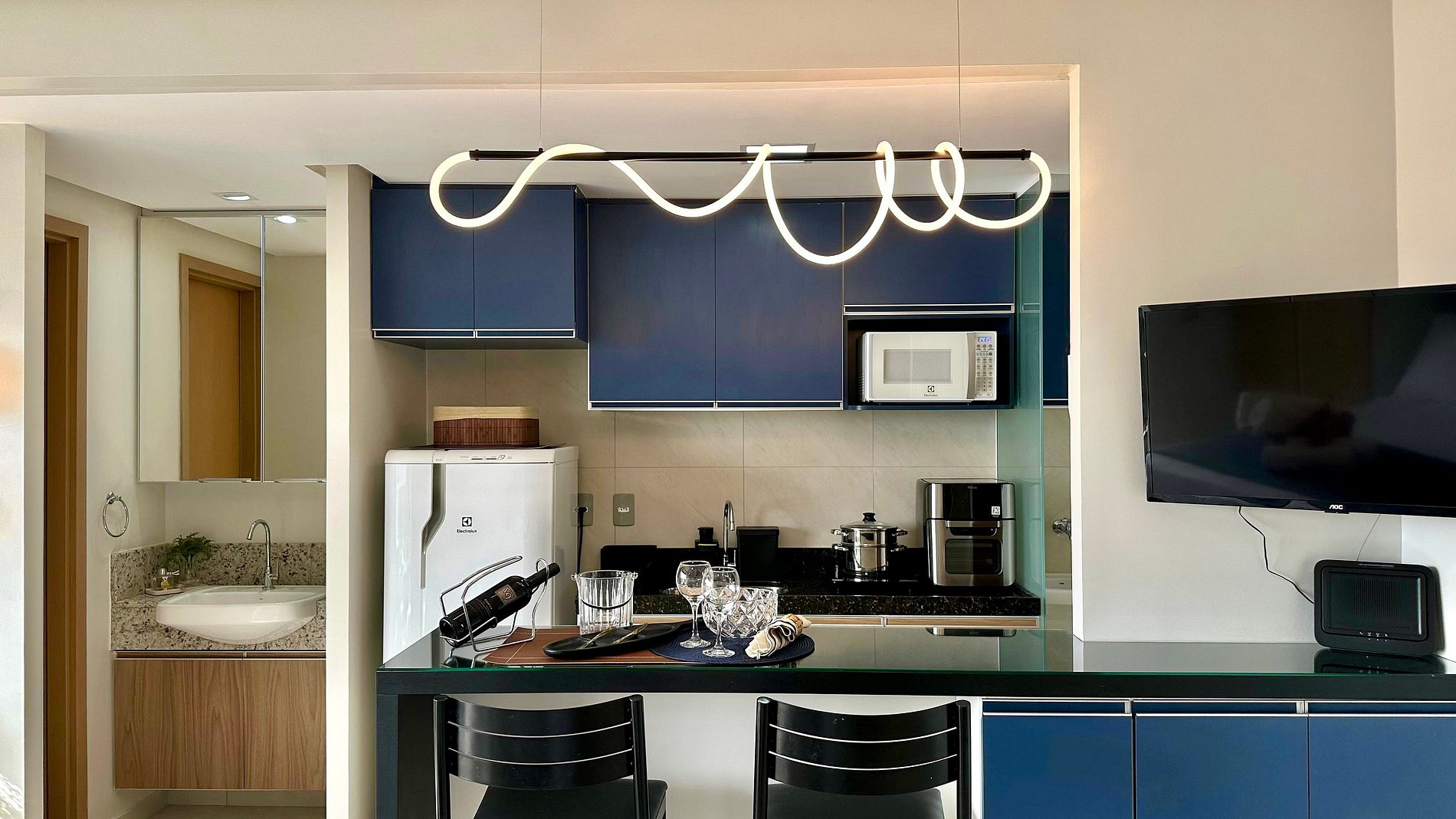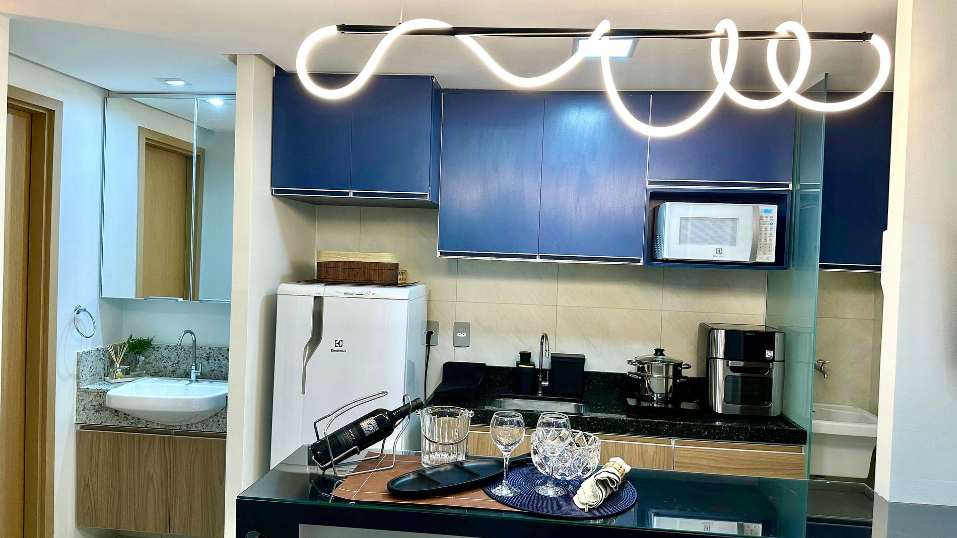 A cozinha é completa com geladeira, micro-ondas, Airfryer, fogão por indução de duas bocas e todos os utensílios básicos para preparo das refeições. Como cortesia, oferecemos cafeteira com cápsulas para uma chegada mais acolhedora.
