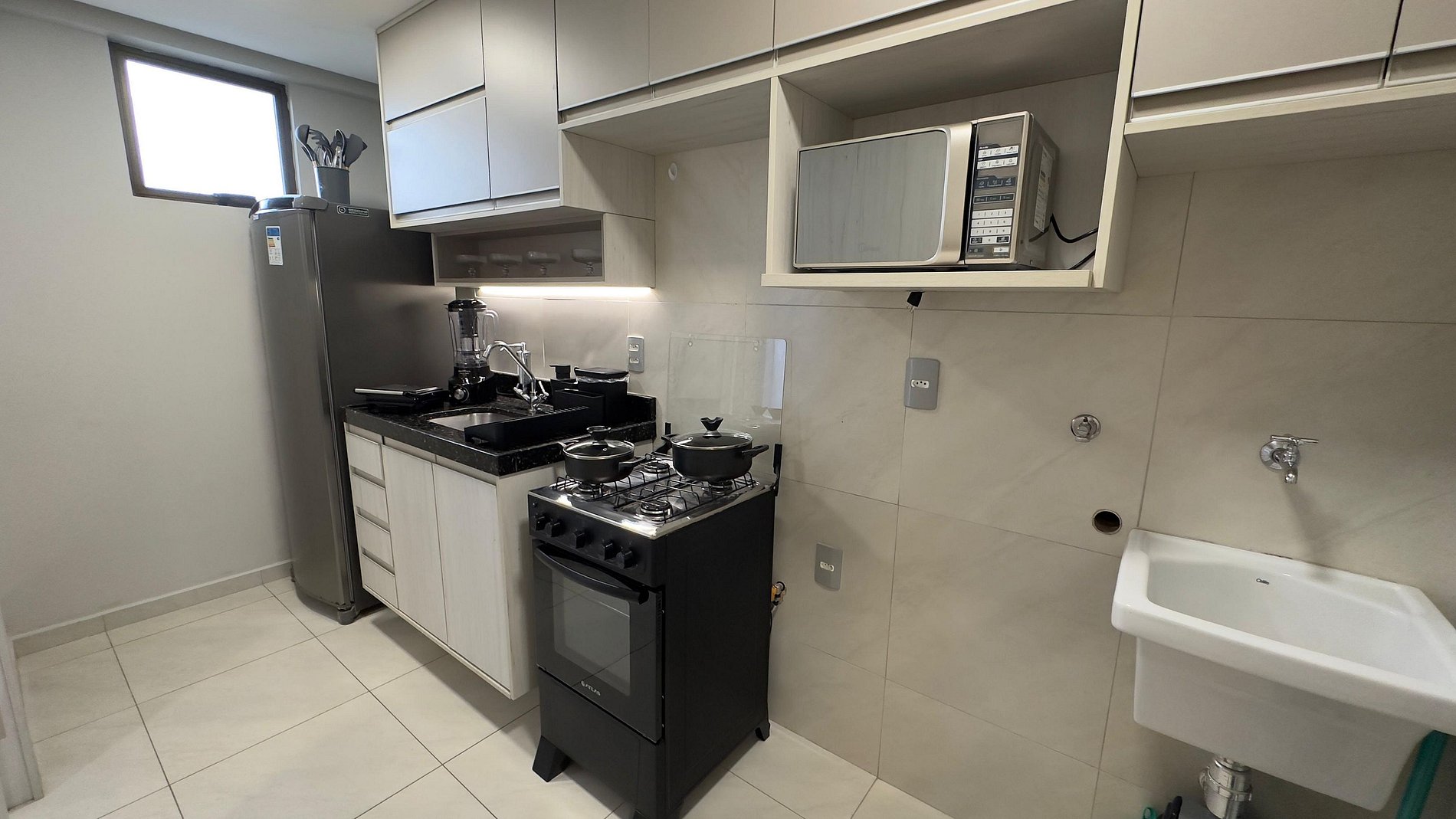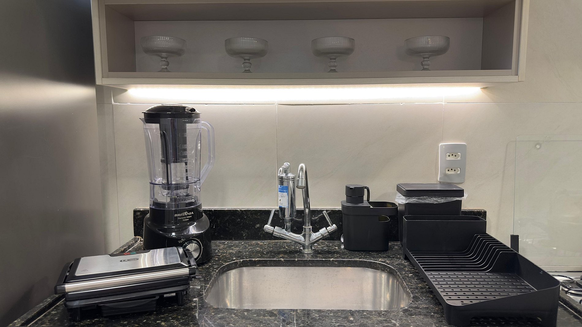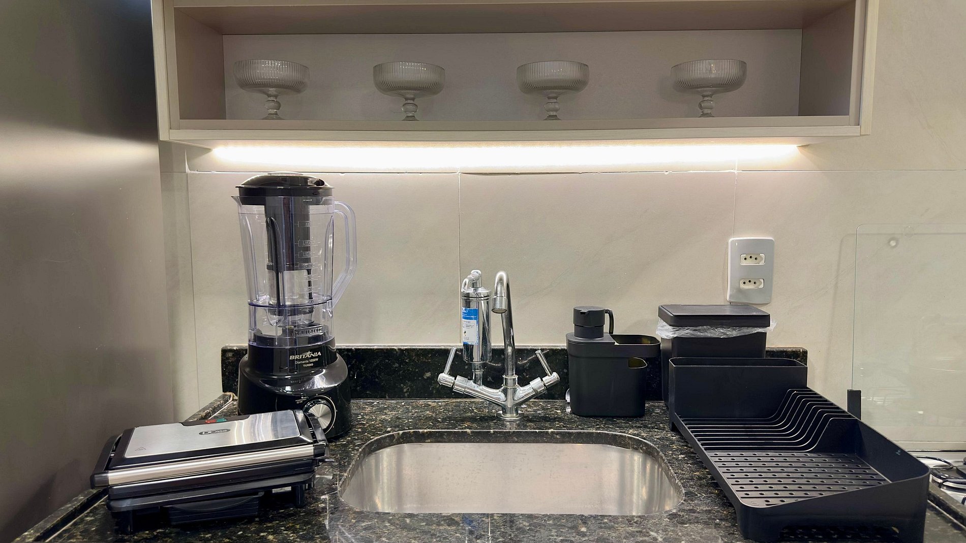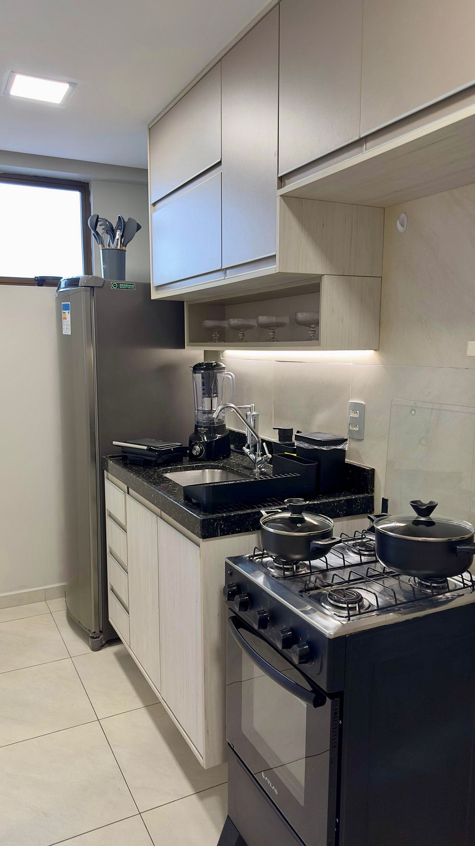 A cozinha é completa com geladeira, micro-ondas, fogão de quatro bocas e todos os utensílios básicos para preparo das refeições. Como cortesia, oferecemos cafeteira com cápsulas para uma chegada mais acolhedora.